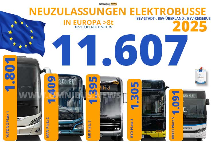 english text below – Es boomt, nach wie vor! Das Segment der Elektrobusse (>8t, Stadt-, Überland- u. Reisebus) hat in den zwölf Monaten des Jahres 2025 erneut deutlich zugelegt, wie aus den jetzt veröffentlichten Zahlen der European Bus Data der DVV Media Group hervorgeht. Waren es 2024 „nur“ 7.855 neue BEV-Omnibusse, so sind es 2025 ganze 11.607 BEV-Busse! Auch für 2025 hat das Team der European Bus Data akribisch alle Neuzulassungen von Omnibussen europaweit im erfasst. Die Zahlen sind bei Herstellern wie Marktbeobachtern geschätzt, um Trends zu erkennen oder auch zu belegen.