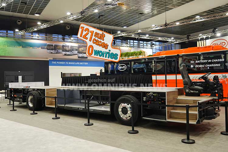 Auf der Busworld 2025 hat BYD aus China seine neuen 12- und 18-Meter-BEV-Stadtbusse auf Basis der neuen eBus 3.0-Plattform präsentiert. Außerdem stellte BYD ein Fahrgestell mit Bodenstruktur für Aufbauhersteller für deren Überlandbusse mit einem 5,7 m³ großen Gepäckraum für 121 Reisekoffer vor. Derzeit seien mehr als 5.000 Elektrobusse BYD-Busse in über 160 Städten in 26 europäischen Ländern im Einsatz, so BYD. Über tausend davon wurden im ungarischen Werk in Komárom hergestellt.