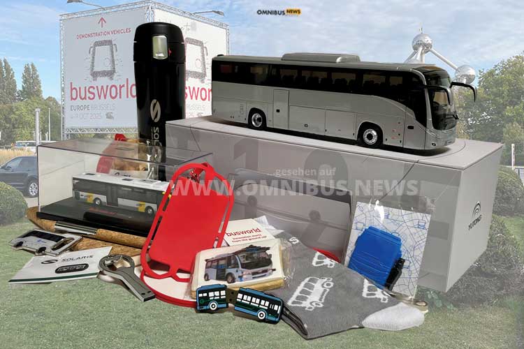 „Kleine Geschenke erhalten die Freundschaft“. Dabei kommt es nicht so sehr darauf an, was man schenkt, sondern vielmehr darauf, dass es von Herzen kommt. Von den Organisatoren der Busworld erhielt man am Eingang einen Leinenbeutel mit dem Aufdruck „BUSWORLD (Herz als Piktogramm) YOU“. Und der Besucher der Busworld wurde geliebt, beim Gang durch die Messehallen kon-nte der Leinenbeutel schnell gefüllt werden: Werbekugelschreiber, USB-Sticks (oft auch schon in Form eines Omnibusses), belgische Waffeln, Getränkeflaschen, Lufterfrischer für das Auto, Süßigkeiten, Socken mit Omnibus-Motiv, eine Smartphone-Halterung oder auch den einen oder anderen Modellbus. Die Welt der Souveniers war so vielfältig wie die Busworld selbst. Und wenn der Leinenbeutel voll war, helfen Bushersteller gerne mit einer Papiertüte (samt Prospekten und kleinem Geschenk) aus..! (Busworld/omnibus.news/Sr)