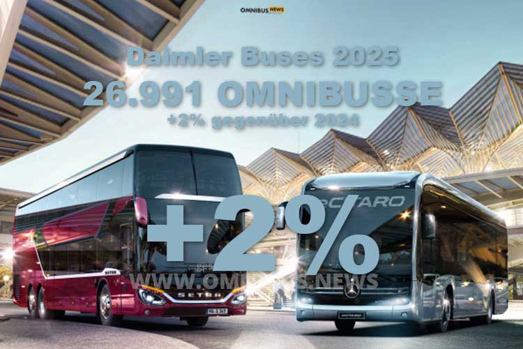 Daimler Buses bleibt im Busgeschäft 2025 auf Vorjahresniveau: Daimler Truck insgesamt beendete das Geschäftsjahr 2025 absatzseitig mit seinem stärksten Quartal und verkaufte konzernweit 422.510 Lkw und Busse (2024: 460.409). Für die Bussparte weist Daimler Truck für das abgelaufene Geschäftsjahr insgesamt 26.991 Einheiten aus, 2024 waren es 26.592. Der Absatz von Daimler Buses belief sich in Q4 2025 auf 7.315 Einheiten (Q4 2024: 7.624), eine kleiner Rückgang auf hohem Niveau. Der Absatz batterieelektrischer Fahrzeuge stieg 2025 um etwa zwei Drittel auf 6.726 Einheiten (2024: 4.035), so der Konzern ohne Details für die Bussparte zu nennen.