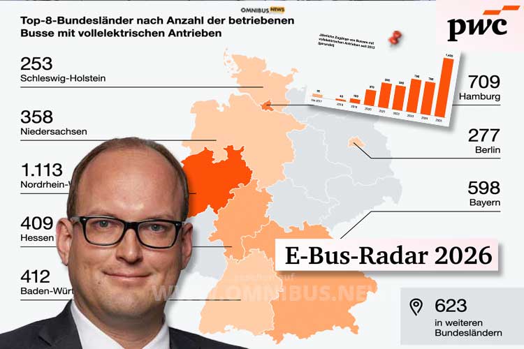 Das E-Bus-Radar 2026 von PricewaterhouaeCoopers (PwC) ist da! Der deutsche Ableger des weltweit führenden Netzwerkes von Wirtschaftsprüfungs- und Beratungsgesellschaften bescheinigt auch für 2025 ein Wachstum im Segment der Elektrobusse – so war es auch schon auf omnibus.news in mehreren Meldungen im Februar und März dieses Jahres zu lesen. Deutsche Verkehrsunternehmen haben 1.397 Elektrobusse neu in Betrieb genommen – fast doppelt so viele wie im Vorjahr. Das heißt: Bei durchschnittlich rund 2.900 Stadtbus-Neuanschaffungen pro Jahr über alle Antriebsarten hinweg fuhr fast jeder zweite neu angeschaffte Stadtbus elektrisch.