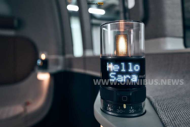 Für eine sensationelle Rundumsicht sorgt vorn wie hinten eine Verglasung aus Makrolon, sogar im Dach gibt es ein Glasmodul! Eine Trennscheibe zwischen vorderem und hinterem Fahrgastraum ist mit einer Flüssigkristall-Technologie ausgestattet, die sich von blickdurchlässig auf opak umschalten lässt. Wem das nicht rfeicht, der kann optional digitale Kerzen nicht nur für ein gemütliches Ambiente bestellen, sondern hier auch eine Sitzplatzreservierung oder eine Botoschaft anzeigen… Ob das Feature in der Serienproduktion noch vorhanden sein wird?