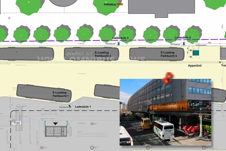 Am Zentralen Omnibusbahnhof in München sollen bis Ende 2026 vier öffentliche Ladesäulen entstehen. Foto: DaimlerBuses; Montage: omnibus.news