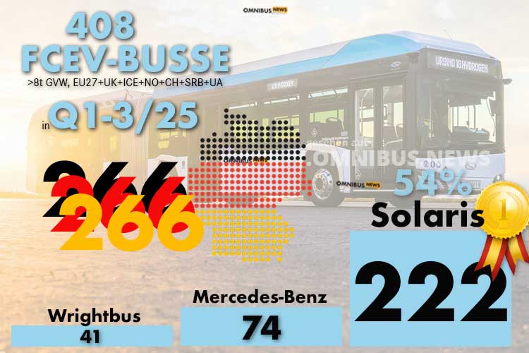 english text below – Freude bei Solaris: Auch wenn die Anschaffungskosten deutlich über denen eines Omnibusses mit Dieselmotor und auch über denen eines Omnibusses mit batterieelektrischem Antrieb liegen, die Zahl der Neuzulassungen im Segment der FCEV-Omnibusse >8t in Europa hat sich in Q1-3/25 im Vergleich zum Vorjahreszeitraum um 163 Prozent gesteigert. Stolze 408 FCEV-Omnibusse sind europaweit neu auf die Straßen gekommen. Die meisten neuen FCEV-Omnibusse wurden in Q1-3/25 in Deutschland zugelassen. Wie sieht das Ranking aus? Solaris war und ist der Primus, denn in Q1-3/25 entfielen auf den polnischen Bushersteller unter dem Dach der spanischen CAF-Gruppe insgesamt 222 der insgesamt 408 Einheiten.