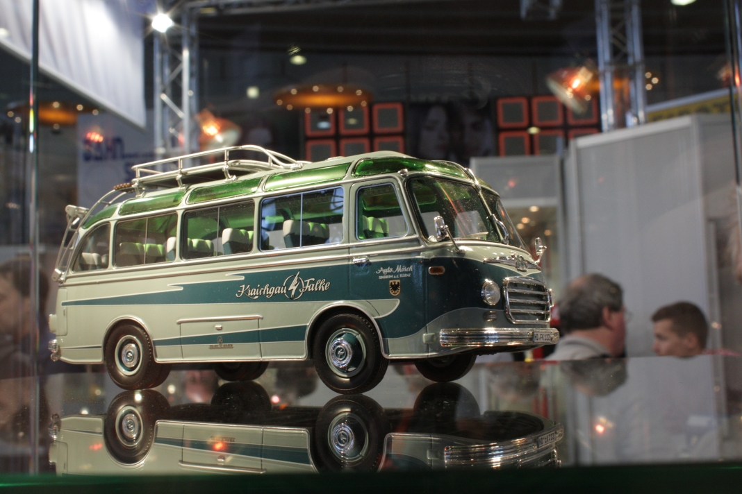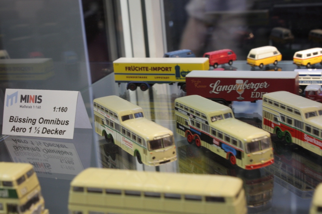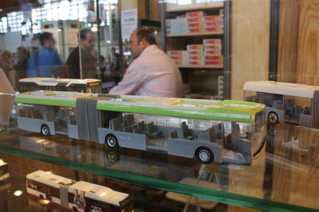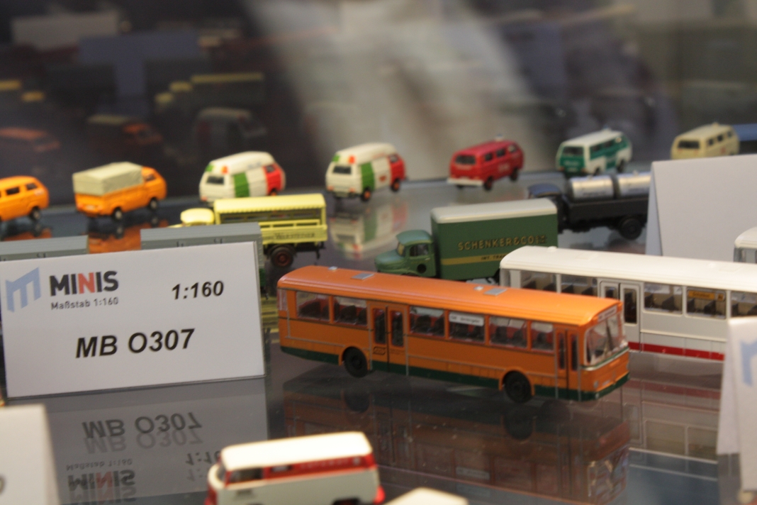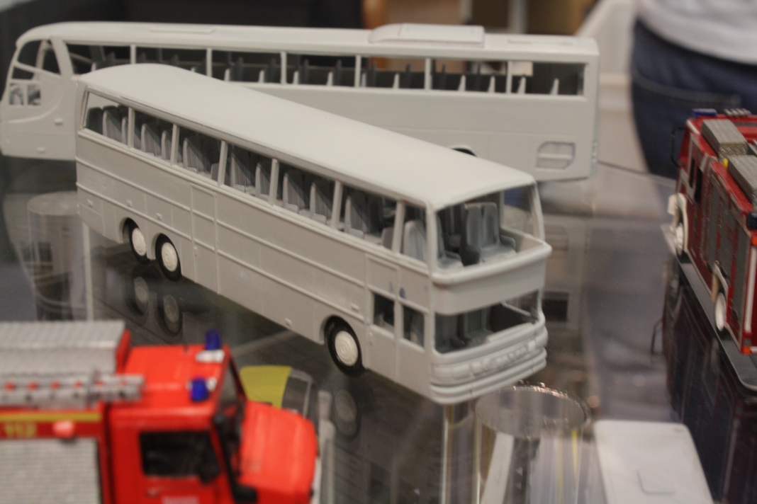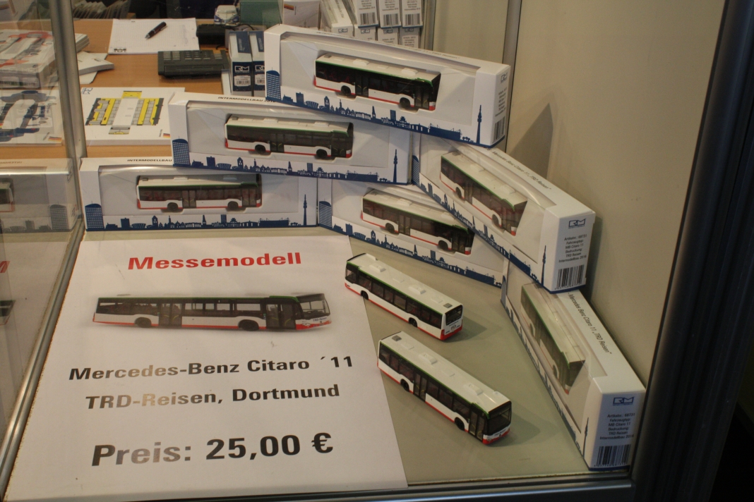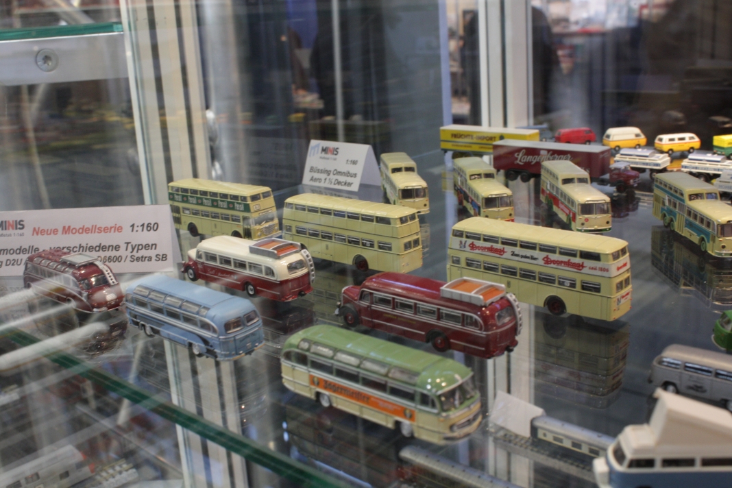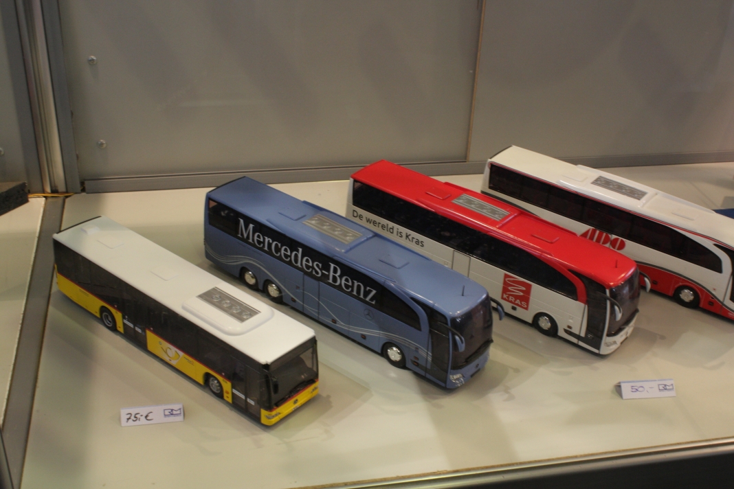 Stefan Frey hat sich auch in diesem Jahr wieder auf der Intermodellbau in Dortmund nach Modellbussen umgesehen. Der Weg ins ruhrgebiet habe sich gelohnt, wie er schreibt. In den letzten Jahre hat sich die Intermodellbau verändert, keine Frage. Hersteller und Händler entschieden sich gegen einen Messeauftritt, neue Anbieter oder auch alte Bekannte waren aber wieder da. Subjektiv waren in diesen Jahr wieder mehr Besucher in den Gängen der Dortmunder Westfalenhallen unterwegs. Aus sich der Modellbusfreunde und -bastler sind natürlich Hersteller wie MEK, Rietze und VK Modelle die Anlaufpunkte Nummer eins. Ja, dieses Jahr war die Firma Rietze mit einem eigenen Messestand in Dortmund zu Gast. Es wurden zahlreiche Modelle zu Messe-Preisen angeboten, zu erwähnen war da der Mercedes Travego in 1/43 in verschieden Ausführungen zu 50 Euro und ein „Wühltisch“ mit 1/87er Modellen zu je 8 Euro. Ferner brachte Rietze ein Sondermodell eines Mercedes Citaro der Dortmunder Firma TRD-Reisen zur Intermodellbau mit. Auch die Firma MEK war dieses Jahr wieder mit einem eigenen Stand vertreten. Alle neu angekündigten Modelle aus dem letzten Jahr wurden als Bausätze angeboten werden, bis auf den IVECO CityClass, der noch einmal nur in der Vitrine zu finden war. Zwei neue Modelle, ein Scania Omniexpress – den Postbus als Fernbus einsetzt – und ein Setra S 216 HDS wurden als Neuheiten vorgestellt. Bei VK Modelle waren die Modelle aus der laufenden Fertigung am Stand zu kaufen. Die schon lange angekündigten Neuheiten des Setra S 12 und des Van Hool A300 waren zumindest durch neue 3D-geduckte Modelle in der Vitrine vertreten. Die Frage nach einem Erscheinungstermin habe ich dieses Jahr nicht gestellt. Weiter gediehen waren die Modelle des Solaris Urbino Nachfolgers, die nun auch als dreitüriger Gelenkbus und Solobus kurz vor der Vollendung stehen. Am Stand von Schuco war der Setra S 6 nicht nur im HO Maßstab, und 1/43 sondern auch als 1/18 Modell zu bewundern. Der große S 6 ist ein echtes Highlight der Modellbaukunst. Daneben wurden auch neue Bedruckungsvarianten bekannte Modelle gezeigt. Ach der Auwärter Neoplan Renndienstwagen war wiederum in der Vitrine. Bei Mo-Miniatur wurde wieder der Mercedes O 321 H im Maßstab 1/32 angeboten. Zu ihm gesellte sich eine Minitaur des NWF SchiStraBusses, der auch mit den passenden Schienenfahrgestellen angeboten wird. Bei ausreichender Nachfrage soll auch eine motorisierte Variante auf den Markt kommen. Der aufgerufene Preis dafür ist gerade nicht vierstellig. Neben den ganz großen Modellen waren auch zwei Mercedes O 321 H in Post und Bahnausführung im Z Maßstab 1/220 am Stand. SAI aus Frankreich brachte die bekannten Modelle mit zur Messe und bot diese zum Kauf an. Neu dazugekommen ist ein Modell des Peugeot D3A/D4A Kleinbusses. Am Stand der Firma Lemke waren im N-Maßstab neben den sehr gut gemachen eigenen Modellen nun auch die Modellbusse von Minichamps in neuen Bedruckungen zu sehen. Als Neuheit unter den eigenen Modellen wurde ein VW T3 angekündigt. Ich habe auch wieder interessante Stücke gefunden, wie die as Wohnmobil hergestellten Blechbusse oder den ferngesteuernten Renault TN6C. Die Kreativität der Modellbauer ist auch im Busbereich fast genzenlos!!! Vielen Dank an Stefan Frey für den Text und die Fotos!