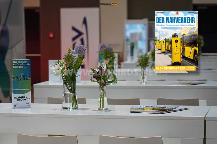 Pünktlich zur Mobility Move 2026 liegt das druckfrische Elektrobus-Spezial der Fachzeitschrift Der Nahverkehr der DVV Media Group in der Ausstellung aus. Foto: omnibus.news