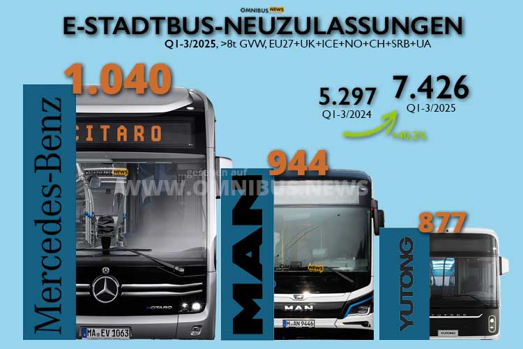 english text below – Zur Halbzeit führte noch Yutong, jetzt rutscht der Elektrobus-Lieferant aus China im Stadtbussegment auf Platz 3 ab. Mercedes-Benz holt sich nach neun Monaten des Jahres 2025 bei den europaweiten Neuzulassungen der Elektro-Stadtbusse >8t mit 1.040 Einheiten die Poleposition. Platz 2 hatte und hat MAN inne, 944 Neuzulassungen der Lion’s City E-Baureihe reichten aus. Aktuell nur auf dem 3. Platz mit 877 Neuzulassungen steht Yutong. Die Zulassungen batterieelektrischer Busse >8t im Segment der Stadtbusse in Europa erreichten nach neun Monaten des Jahres 2025 insgesamt 7.426 Einheiten, wie aus den European Bus Data der DVV Media Group hervorgeht. Der Boom bzw. ein steter Aufwärtstrend der letzten drei Jahre setzt sich also fort.