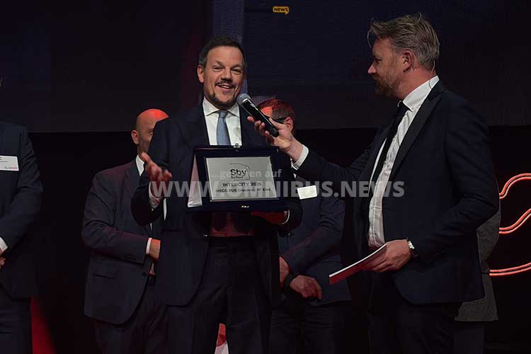 Für Iveco Bus kam Claudio Passerini, Präsident der Bus Business Unit der Iveco Group, auf die Bühne, um den Award für den Überlandbus Crossway LE Elec abzuholen. Foto: SBY/Busworld